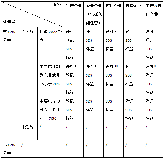 除了上述比較重要的幾個條目外,指南還給出了所有危險化學品名錄中物質的分類,供企業編制SDS和標簽,危險化學品登記的時候進行參考。此外,其他幾個條目對于危險化學品做了其他規定,企業可以參考具體的條目進行分析,看自己的產品是否需要具體應對這些義務。下文的表格給出企業可能涉及到的一些義務的解析: