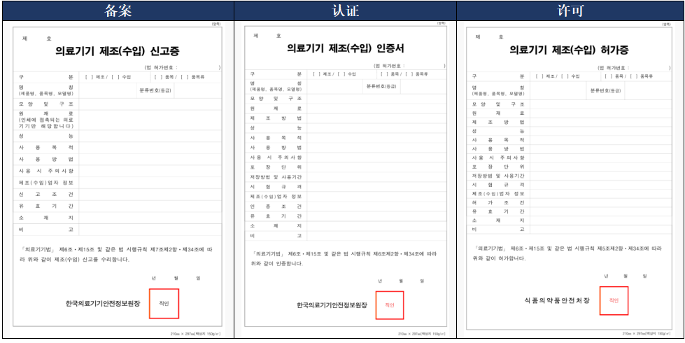 II類 | - | O | O *與已認證醫療器械在結構等方面不具有實質性等同的醫療器械 *MFDS指定的需要許可的醫療器械 |