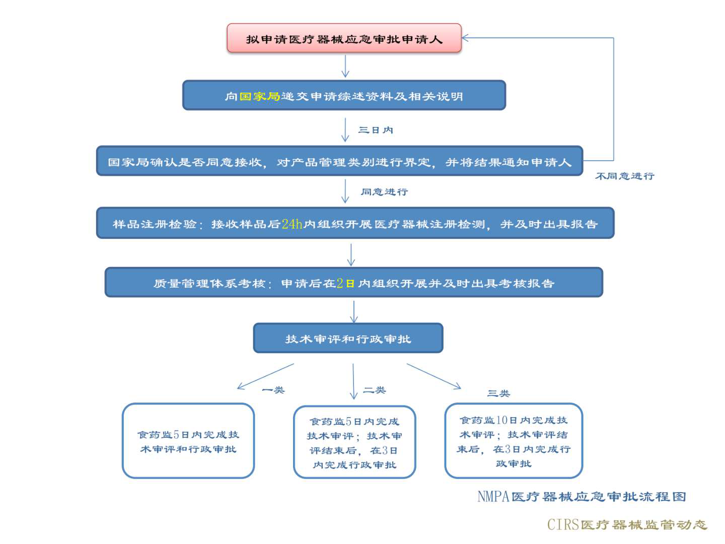 檢測中心24h內開展應急注冊檢驗;審評中心在收到體系核查申請后,2日內組織應急注冊體系核查;在接到注冊申請資料后,應在5日內完成技術審評;技術審評結束后,行政審批部門應當在3日內完成應急行政審批。
