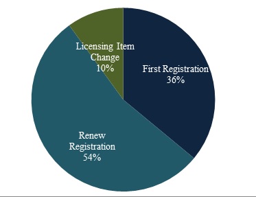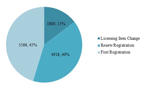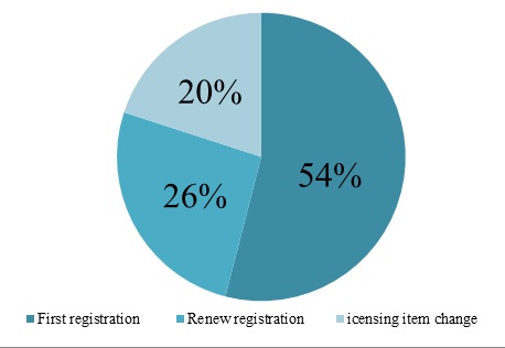 Distinguished by registration form, first registration application number is 499, account for 17%; renew application is 1895, 65%; and licensing item change application is 630, 20%.