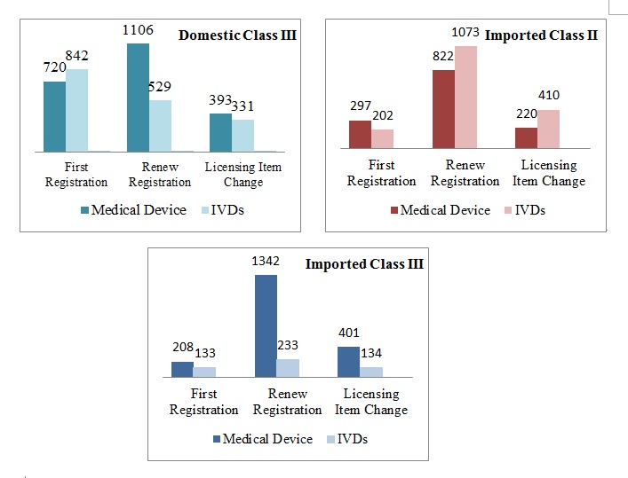 For imported IVDs, CFDA has approved 326 first registration applications, 879 renew registration applications, and 266 applications of licensing item change.