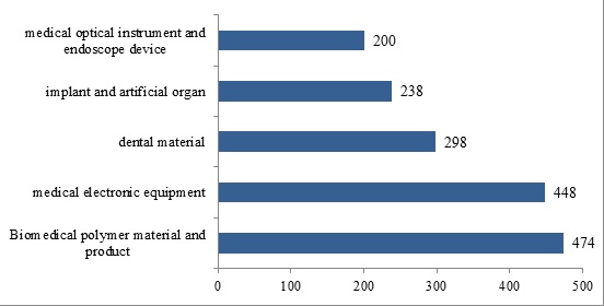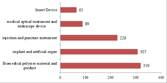The top five products of registration quantity are: Biomedical polymer material and product, implant and artificial organ, injection and puncture instrument, medical optical instrument and endoscope device, and insert device.