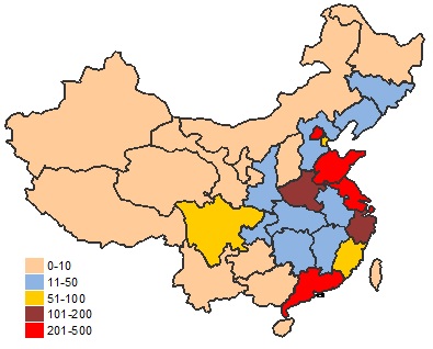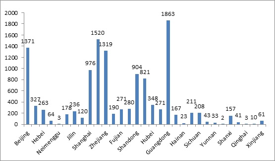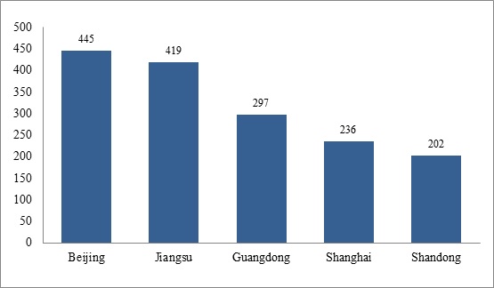 The top five provinces are Beijing, Jiangsu, Guangdong, Shanghai, Shandong, which make up 67% of first and renew registration in 2015.