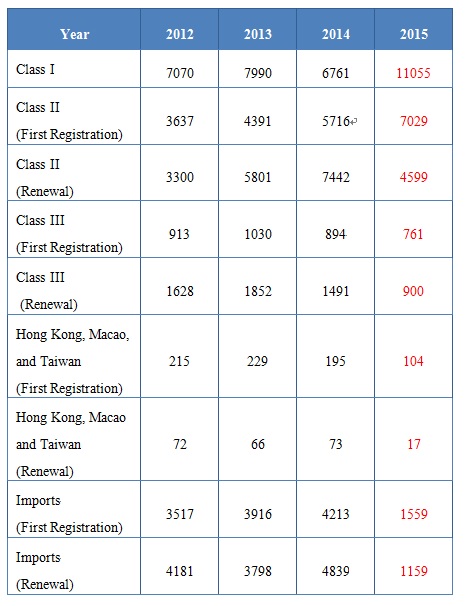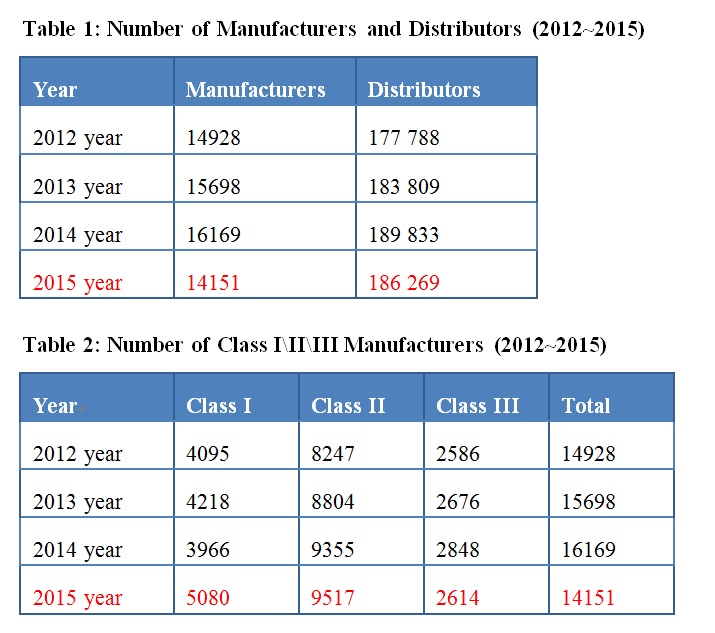 Up to the end of 2015, CFDA has recorded 11055 Class I medical device and approved 11628 Class II medical device, 1661 Class III medical device, in which, the number of medical devices which from Hong Kong, Macao and Taiwan is 121, and imported medical devices is 1559.