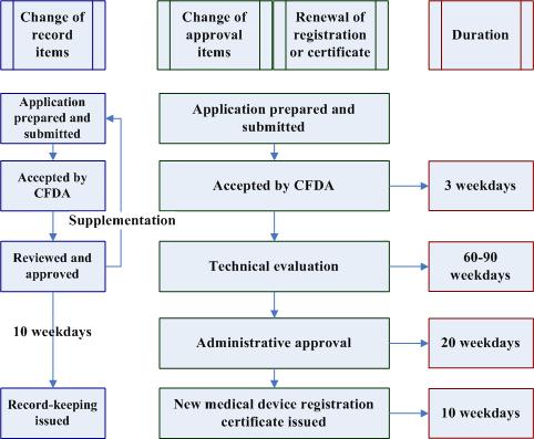 | Devices | Product name, model, specification, structure and composite, applicable scope, technical requirements, manufacture address of imported medical device, etc. | Administrative approval |