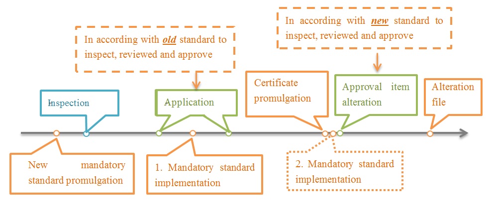 During this period that new mandatory standards have been issued but not yet implemented, if your registration application has been received, so not matter whenever you summit your registration application, before or after mandatory standards implementation, the officer will inspect, review and approve according to old standards. And from the day of standards implementation, you shall manufacture your product according to the new standard. If the mandatory standards have been implemented, and your application is still in the situation of review and approval, you cannot submit the alteration application until your certificate has been issued. To know how to apply for the alteration application, please see here.