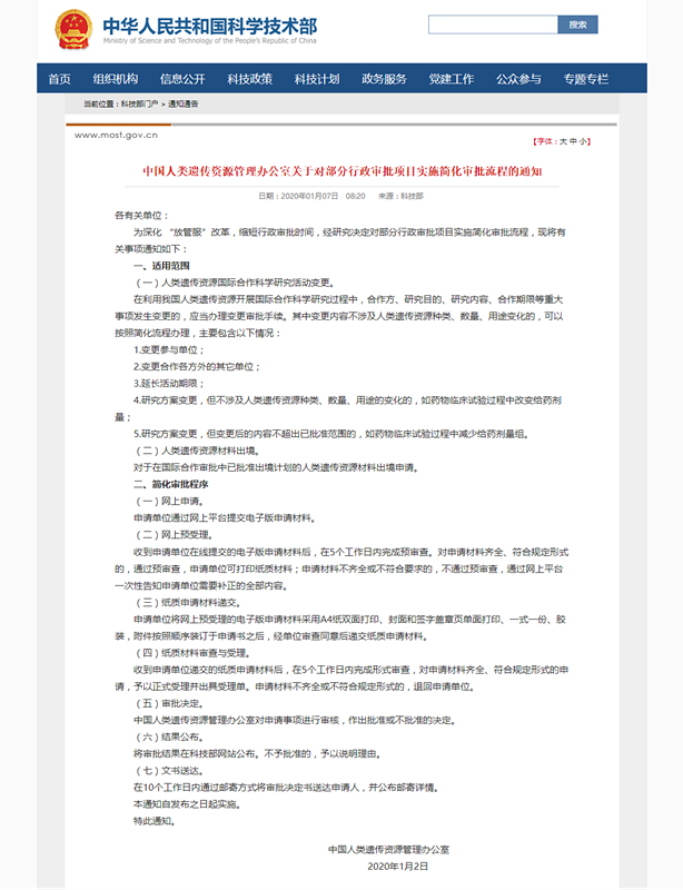 On January 07, 2020, the Ministry of Science and Technology of the People's Republic of China issued a notice on simplifying the approval process for some administrative approval projects.