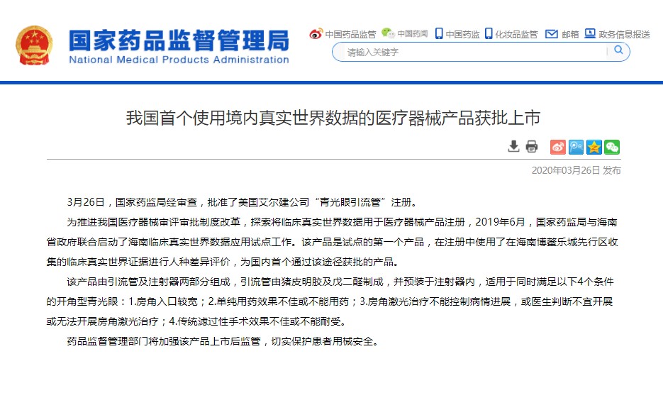 On March 26th, 2020, the NMPA approved the registration of “Glaucoma Drainage Tube” product from Allergan, Inc.