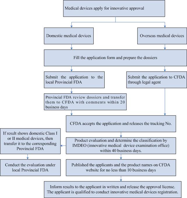 - The dedicated staff: CFDA set the innovative medical device examination office and form the innovative medical device expert group to be specifically responsible for the approval of innovative medical device. Specialized person is appointed by the applicant located provincial FDA, and specialized person is appointed by the innovative medical device examination office respectively to timely communicate with applicants and provide guidance.