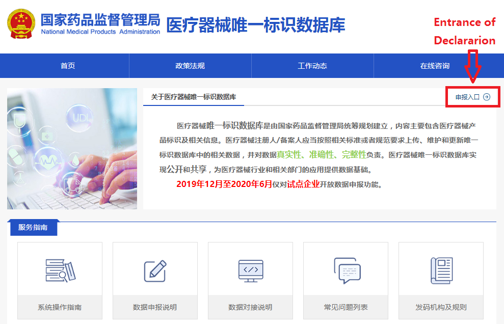 In order to make it easier for the public to view the development of the UDI system for medical devices, the "Medical Devices" section of the website of the NMPA has opened a "Medical Devices UDI System" column (see Figure 1). After clicking into the column, you can query related policies and regulations, work trends, database operation guidelines, etc. (as shown in Figure 2), and you can also enter the UDI database declaration login page (see Figure 3) through the "Entrance of Declaration" on this page.