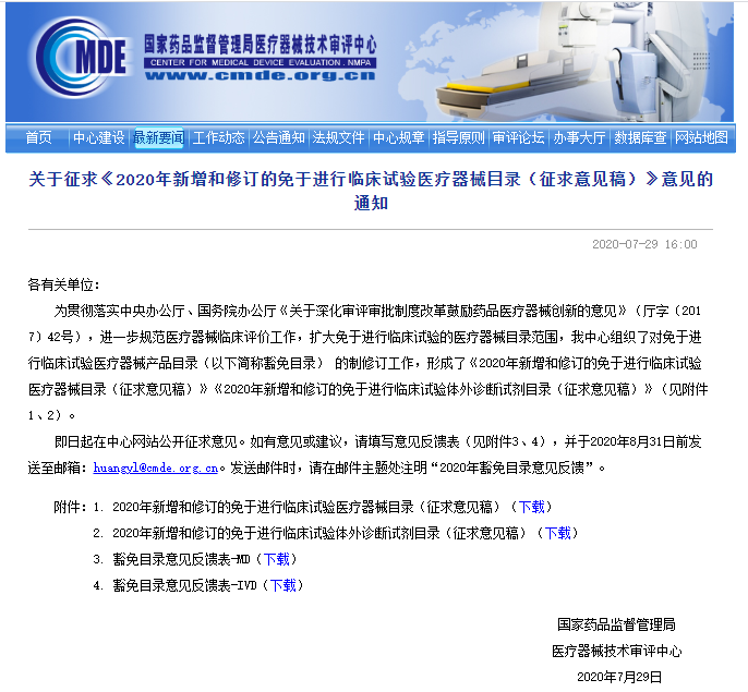 2020, July 29th, in order to further standardize the clinical evaluation of medical devices and expand the scope of the catalogue of medical devices exempt from clinical trials, the Center for Medical Device Evaluation of NMPA organized the revision of the catalogue of medical devices exempt from clinical trials. The "New and Revised Catalogue of Medical Devices Exempt from Clinical Trials in 2020 (Draft for Comment)" and the "New and Revised Catalogue of In Vitro Diagnostic Reagents Exempt from Clinical Trials in 2020 (Draft for Comments)" were published.